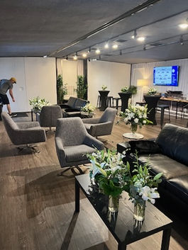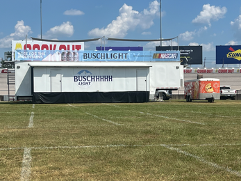 Enclosed Double Expandable with 900 sq ft interior, roof deck, private bathroom, storage, and TVs. Hosts up to 75 guests. Perfect for festivals, trade shows, tours, golf, tailgates, VIP experiences, and outdoor events.